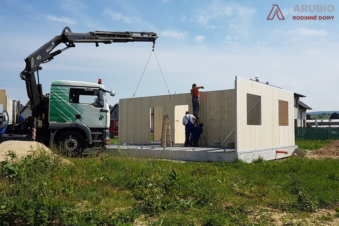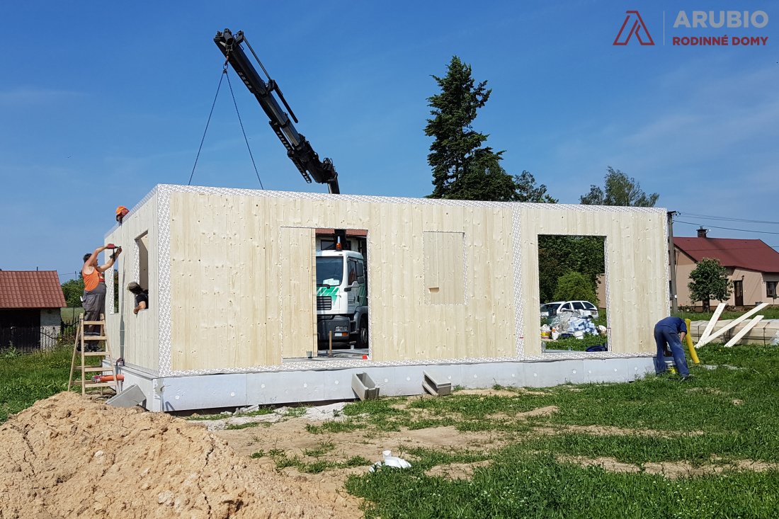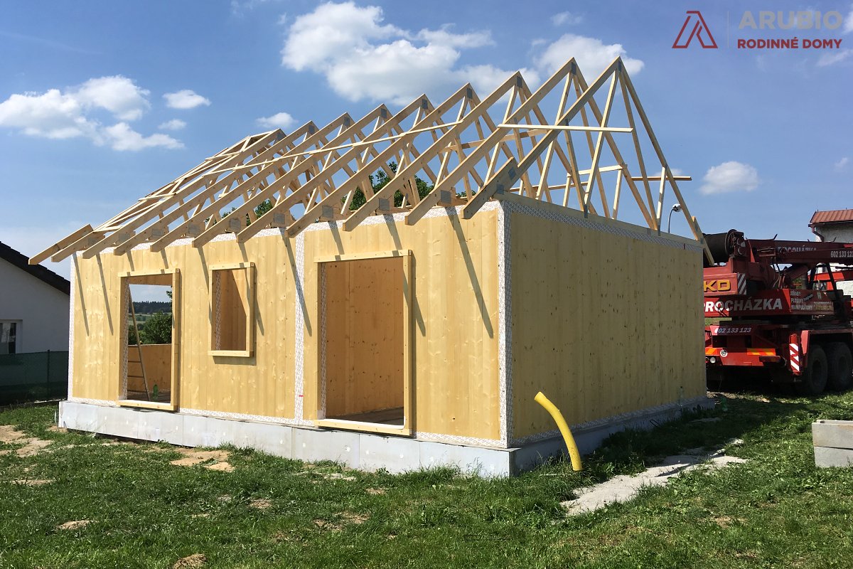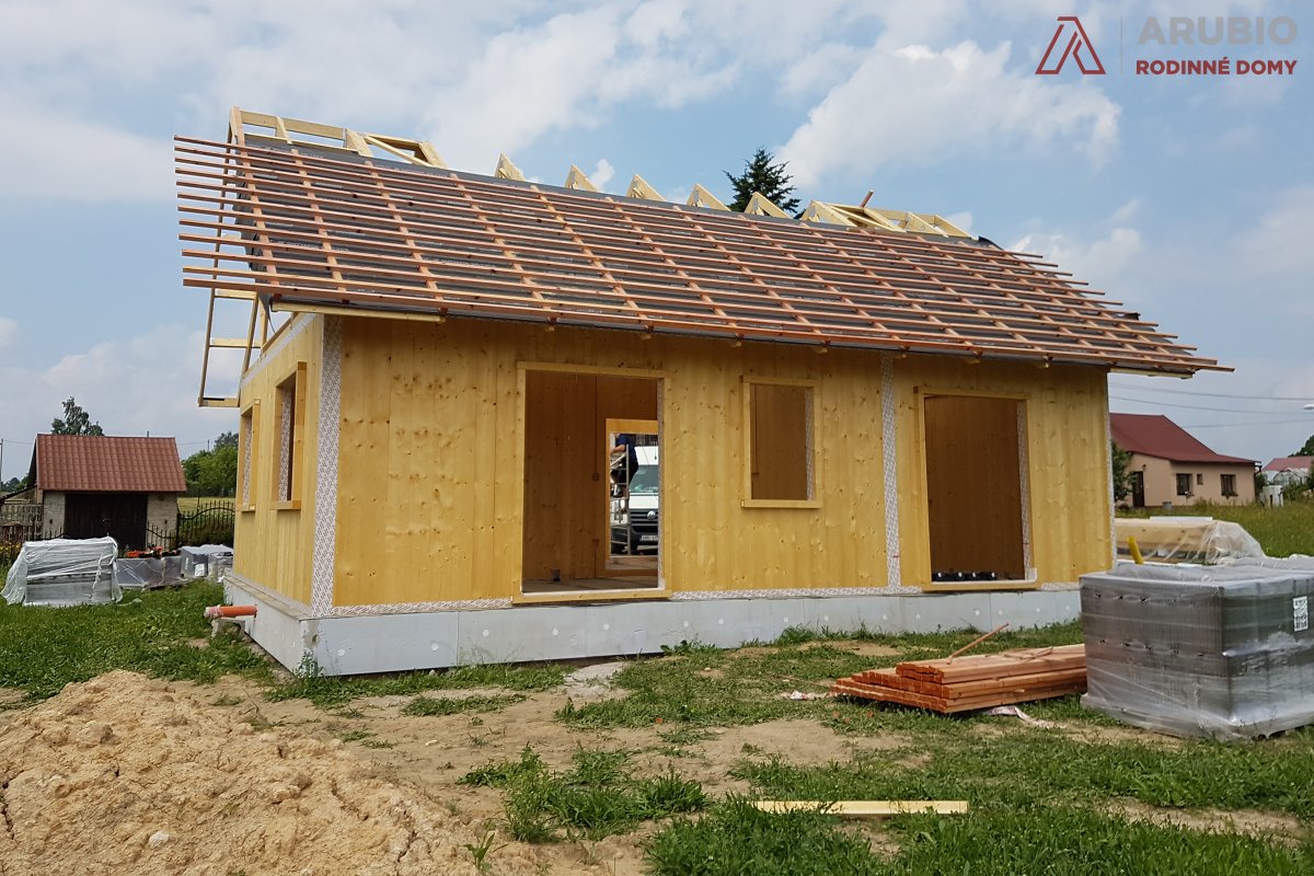 Další stavbu z masivního dřeva jsme realizovali v obci Bezděkov nad Metují v okrese Náchod. V květnu 2018 zde vyrostl malý bungalov obdelníkového půdorysu 10 x 7,5 metru se sedlovou vazníkovou střechou se sklonem 35 stupňů. Vnitřní užitná plocha domu činí 63,5 metrů čtverečných a je dispozičně řešen jako 3+kk.