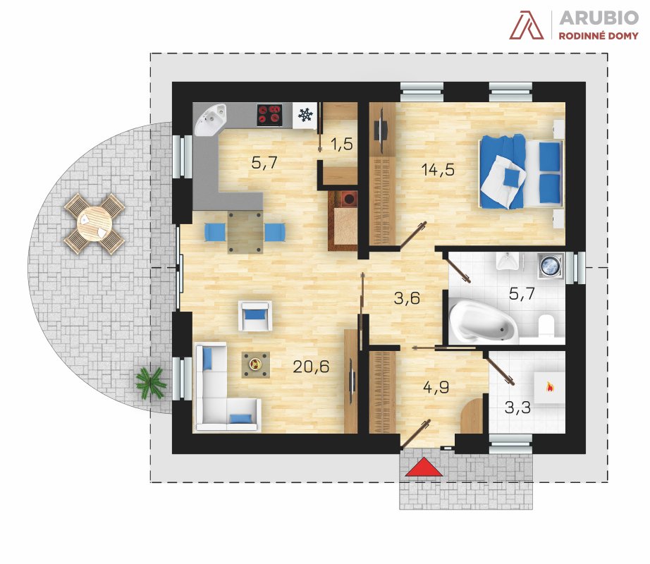 Do ložnice o výměře 14,5 m² se pohodlně vejde i rozměrnější dvojlůžko a vestavěná šatní skříň. V koupelně je dostatek místa jak pro rohovou vanu, tak i pro toaletu a pračku. Ke skladování sezónních věcí i k umístění kotle či boileru je v domě navržena technická místnost, která je přístupná přímo z předsíně.