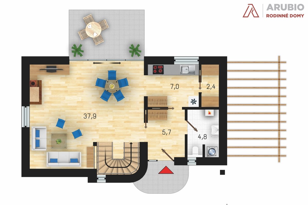 Podkrovní dřevostavba podle projektu Domino bude útulným domovem pro početnější rodinu. Na užitné ploše 111,3 m² najdete tři ložnice, obývací pokoj s jídelnou a oddělenou kuchyň. V zádveří se nachází vstup do koupelny (4,8 m²), kuchyně (7 m²) s praktickou komorou či spíží a do hlavní obytné místnosti (37,9 m²), která je spojená s jídelnou.