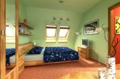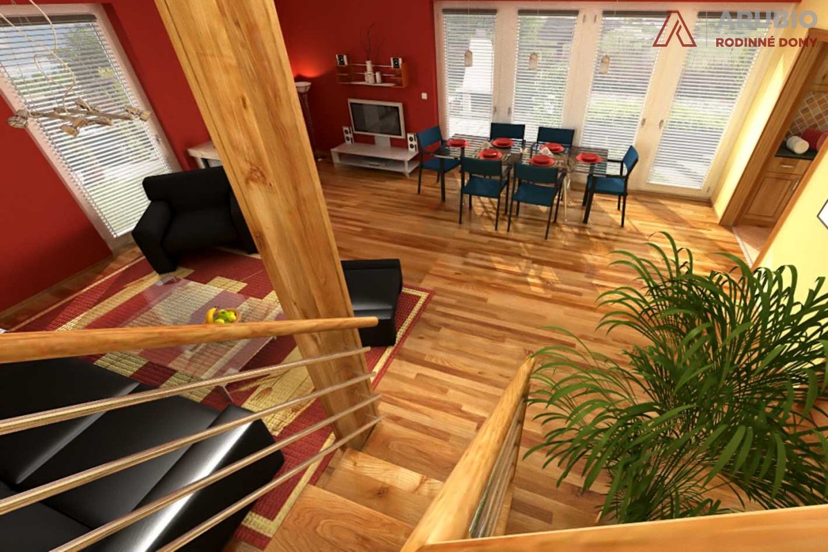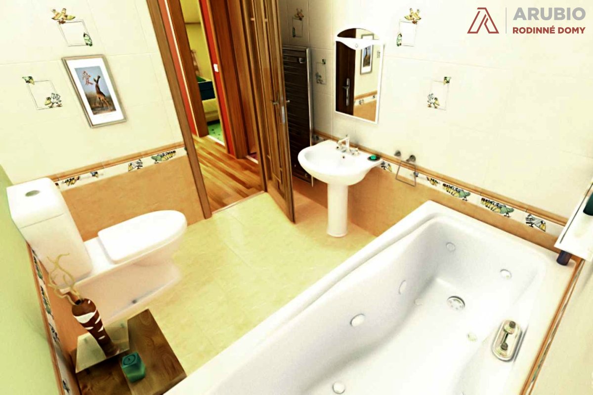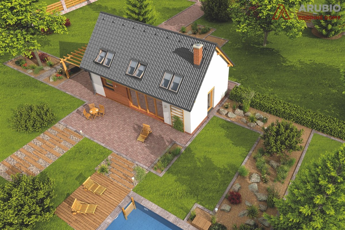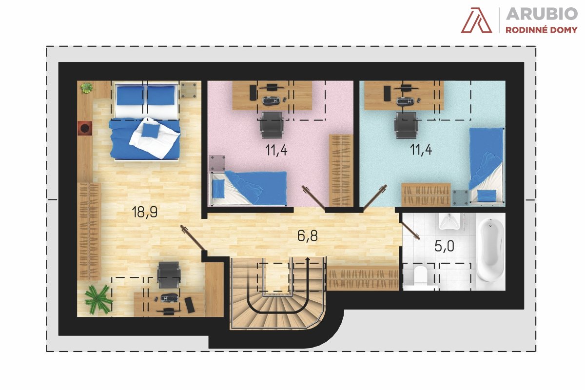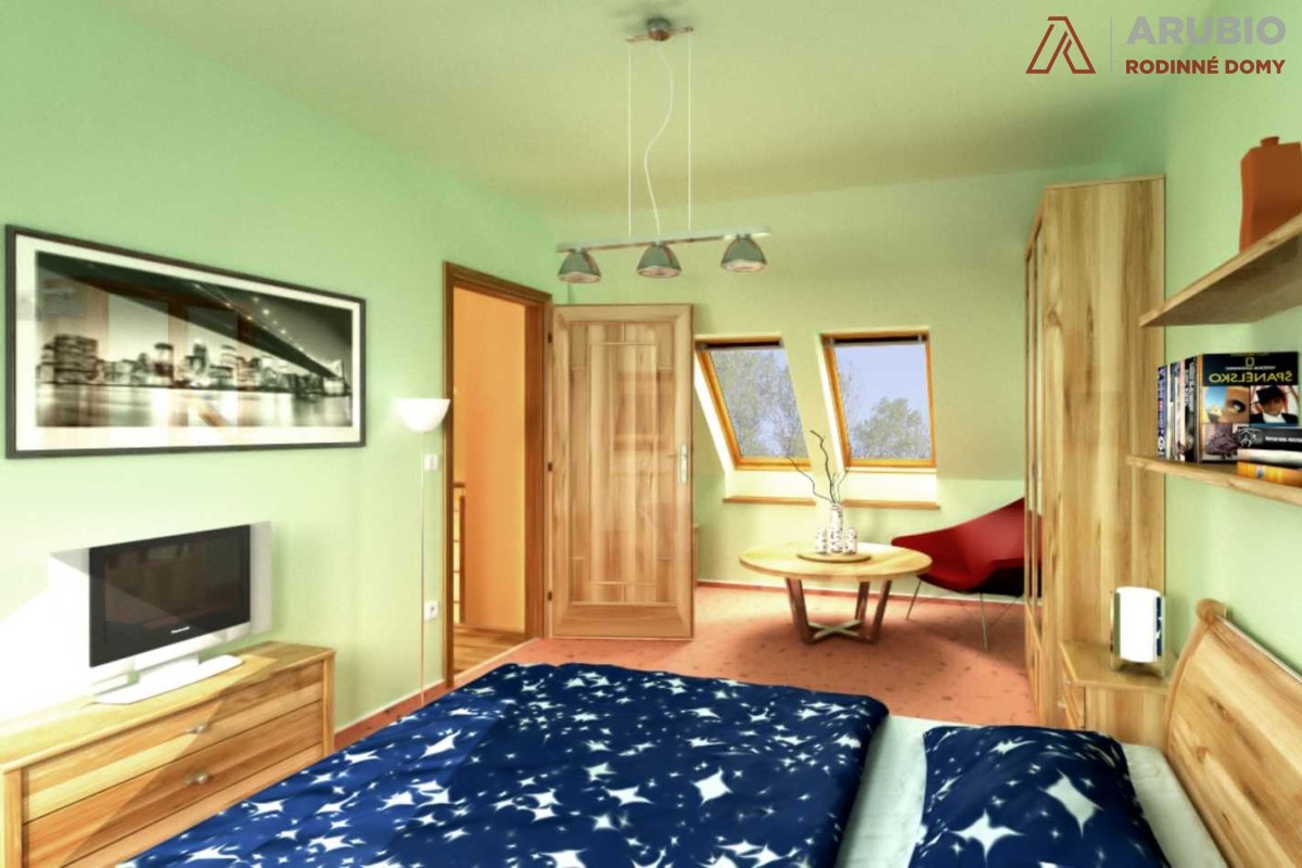 V podkroví se nacházejí tři ložnice, dvě z nich o rozměrech 11,4 m², třetí pak 18,9 m² a je zde také prakticjy umístěna druhá koupelna. Dostatek denního světla přivádějí do podkroví střešní okna, jejichž počet i velikost lze na přání upravit.