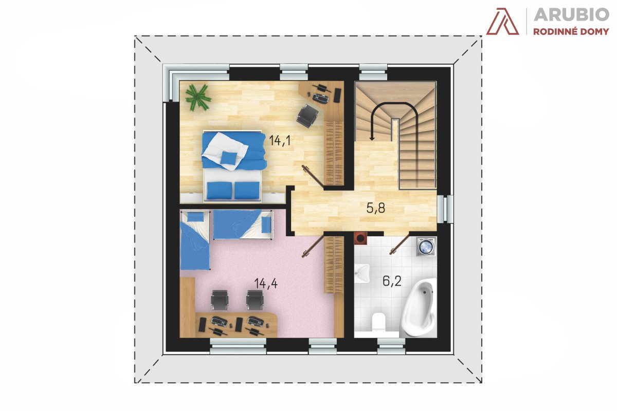 Díky tomu, že je dřevostavba Pikolo navržena se stanovou a nikoliv sedlovou střechou, jsou prostory v patře plnohodnotně obyvatelné a využitelné. Ložnice mají plochu 14,4 a 14,1 metrů čtverečných. Díky tomu lze v pokojích instalovat větší vestavěné skříně, nebo počítat s využitím ložnice pro dvě děti. Koupelna (6,2 m2) je pak navržena s rohovou vanou, toaletou a prostorem pro bojler a pračku.