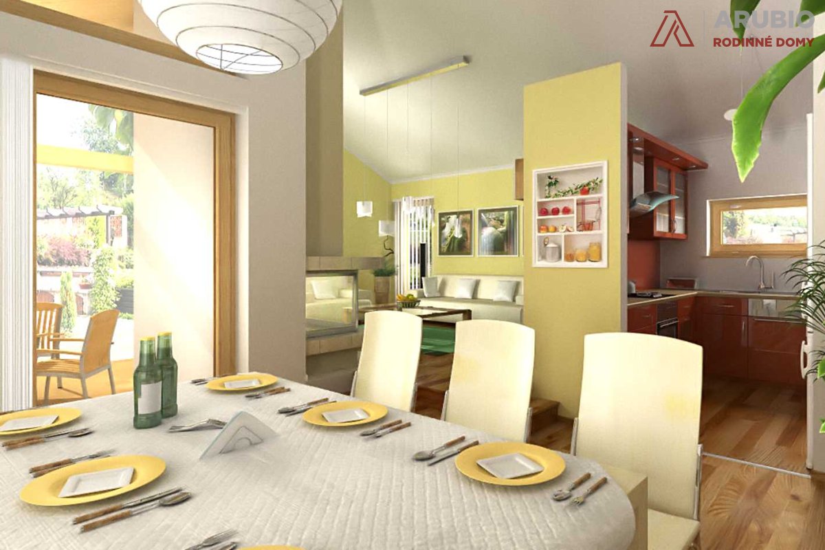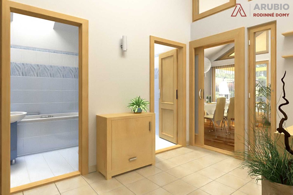 Na ploše 76,6 m² dřevostavby najdete dvě stejně velké ložnice o 12,6 metrech čtverečných. Dostatek denního světla v nich bude díky velkým francouzským oknům, která lze v případě požadavku klienta změnit na klasická. Druhou ložnici lze využít jako dětský pokoj, pracovnu nebo pokoj pro hosty. Obývací pokoj (27,7 m²) je propojen s prostornou jídelnou. Kuchyňský kout je částečně oddělený a počítá se v něm vestavěnou spíží, kterou je možné nerealizovat a vzniklý prostor využít k osazení kuchyňskými skříňkami.