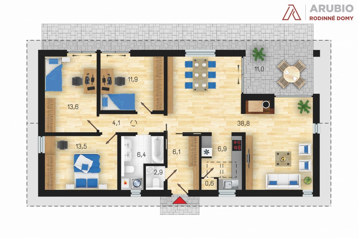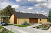 Uno 2 je větším bratrem bungalovu Uno 1 a Uno 3 a patří jednoznačně k těm nejžádanějším projektům. (Uno 1 a Uno 3 také naleznete v našem modelovém katalogu). Svou oblibu si Uno 2 získalo pro svůj velmi nekomplikovaný kompaktní vzhled díky téměř obdelníkovému půdorysu (narušuje ho pouze integrovaná terasa o ploše 11 metrů čtverečných) a tradiční sedlové střeše, která má sklon 25 stupňů.Projekt dřevostavby na klíč Uno 2 nabízí vnitřní užitnou plochu 104,8 m2, která zcela uspokojí nároky a potřeby velké rodiny. Dispoziční řešení dřevostavby Uno 2 je netradiční, neboť je lze považovat za 4+1, ale také 5+1, a to díky od kuchyně oddělené prostorné jídelně. Další pokoje mají plochu 13,6, 13,5 a 11,9 metrů čtverečných. Okna navržená jako posuvná lze i kvůli úspoře pořizovacích nákladů na přání realizovat jako klasická otvíravá.